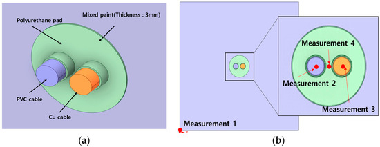 The mixed paint material was applied to the front and back of the penetration area at a thickness of 3 mm. The fire stability was compared when the mixed paint was applied to the penetration area and when it was not applied to the penetration. To predict the fire safety of the penetration area, a simulation was conducted by setting the measurement points at the firewall wall (point 1), copper cable (point 2), PVC cable (point 3), and between the two cables (point 4). Figure 4 shows the mixed paint applied to a thickness of 3 mm and the fire stability measurements at four locations.