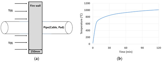 The fire simulation conditions were set as follows. When a fire occurs in the penetration part of the firewall, the total time for which the fire occurs and the temperature according to the time the fire lasts are set as shown in Figure 5, in accordance with ASTM E119 [26].