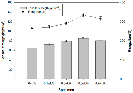 The results of the analysis of tensile strength and elongation of the mixed paint according to the mass fraction of expandable graphite are shown in Figure 8. According to existing research results, when carbon nanotubes or graphite, which are inorganic materials, are added to polymer solutions or high-viscosity materials, physical properties are slightly improved [27,28,29].