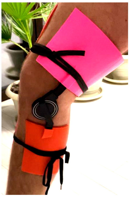 Numerous studies have been conducted on developing smart, easy-to-use knee orthoses [2,3,4,5,6,7,8,9]. However, few have focused on the patients’ motivation to correct their movement. By utilizing electrical muscle stimulation (EMS), patients can accurately identify when an incorrect movement has been performed, thus encouraging them to correct the error. The 3D-printed knee orthosis is equipped with embedded IMU (Inertial Measurement Unit) sensors that measure and analyze joint orientation, acceleration, and rotation. This precise movement data can identify deviations from prescribed movement patterns or improper joint alignments. Additionally, strategically located EMG (Electromyography) sensors on the surrounding leg muscles provide real-time feedback on muscle activation levels, enabling the evaluation of muscle coordination during knee movements.