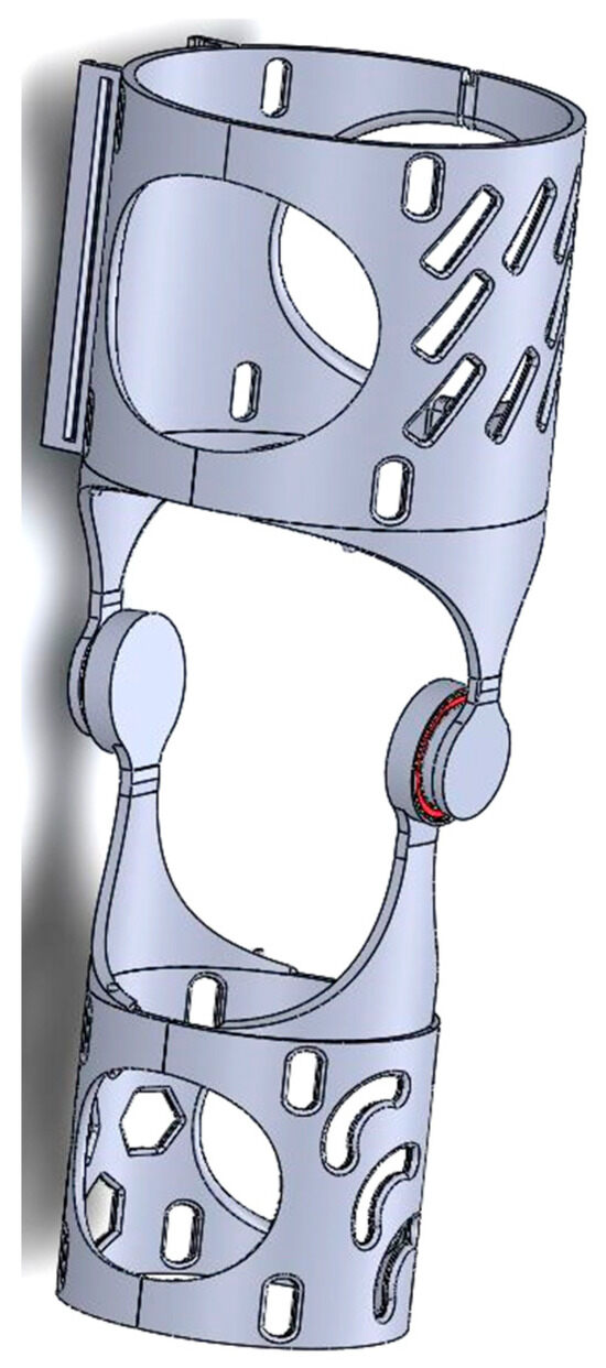 SolidWorks 2022 was chosen as the CAD design phase software to create the final proposed device (see Figure 5). Solidworks provided a comprehensive set of tools and features that enabled precise and meticulous design detailing. Due to its advanced features and capabilities, the design process involved multiple iterations and extensive testing to ensure the best possible device was created. From the positioning of components to the overall ergonomics and user experience, every aspect was subjected to meticulous analysis. The challenge of striking the right balance between form and function required careful consideration. The goal was to create a device that was not only visually appealing, but also offered optimal performance and comfort. Bearings are still included in the final design of the project, similar to the approach taken in the first iteration. The use of bearings offers significant benefits in terms of facilitating smooth motion and reducing friction within the device. The bearings selected are 6808 2RS. The ability of the 6808 2RS bearings to effectively handle both radial and axial loads was one of the key factors in their selection. This was due to the dynamic nature of the knee joint and the various forces and movements to which it is subjected. The 6808 2RS bearings were found to have the required load capacity, allowing the orthosis to withstand the complex forces while maintaining reliable and seamless motion.
