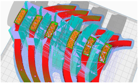 During the 3D printing phase of the orthosis, a diverse array of methods and tools were employed to optimize fabrication processes and attain the desired outcome. Among these methodologies (see Figure 8), 3D printing infill patterns, Grid, Triangles, and Gyroid, pertained to the utilization of tree supports (turquoise color in Figure 8), a functionality accessible slicing software platform like Cura (Version 5.6.0). Additionally, supplementary techniques were employed to augment the printing procedure and bolster the overall quality of the resultant orthotic structure. For the printing outcomes within the present study, using rPET and PLA material (see Figure 9, Figure 10 and Figure 11), it was used for the printing-process-encompassing parameters (see Table 2) such as layer height, print speed, and temperature settings, to ensure optimal print quality and adherence to design specifications.