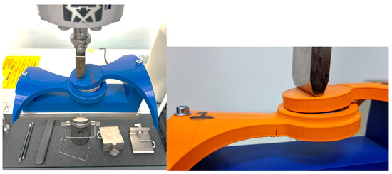 Figure 12 illustrates a photograph capturing the sample during the bending test using the Instron 3366, Dual Column Tabletop Models (Instron Inc., Norwood, MA, USA). Notably, the grips employed in the testing apparatus for both the orthosis and its constituent fragments were fabricated using 3D printing technology. The primary criterion guiding their selection was to guarantee the steadfast stability of the designated sample throughout the duration of the measurements.