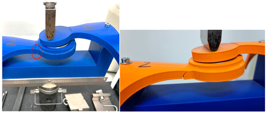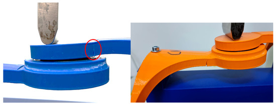 Figure 13, Figure 14 and Figure 15 showcase photographic representations of the sample undergoing the bending test. The grips utilized in the testing apparatus for the orthosis pivotal assembly parts, crafted through 3D printing methodologies using rPET and PLA, are instrumental in upholding the stability of the designated sample throughout the testing procedures. The efficacy of these components is evaluated based on their capacity to sustain stability during the testing process.