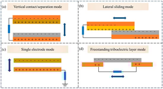 In 2012, Zhong Lin Wang’s team introduced the world’s first TENG. Since then, applications based on TENG have been emerging in various fields, offering new possibilities for harvesting and reusing physical or physiological energy that was previously challenging to utilize. This discovery has greatly sparked researchers’ enthusiasm for further exploration [45]. This technology leverages the triboelectric effect and electrostatic induction, two ancient and familiar natural phenomena, to provide clean energy solutions for various applications [46]. Essentially, when two different materials come into contact, the transfer of electrons between them generates charges. These charges lead to the generation of a potential difference when the two objects separate, which forms the basis for TENG’s electricity generation. Through repetitive contact and separation, along with the relative motion between electrodes, TENG can produce periodic electrical current pulses, powering a variety of devices [47]. Over time, researchers have progressively developed and refined the four principal operational modes of the TENG, grounded on the principle of contact electrification. These include the vertical contact/separation mode, lateral sliding mode, single-electrode mode, and freestanding triboelectric layer mode [48,49].