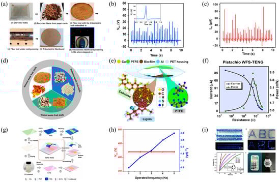 (a) Manufacturing flowchart for TENG fiber board; (b) VOC and (c) ISC outputs when TENG fiber board is repeatedly stepped on by a person of normal weight; reprinted with permission from Ref. [35]. Copyright 2016, Elsevier. (d) A photograph of the lignin powder derived from discarded biomaterials; (e) the schematic diagram of the TENG device based on wood fiber substrates; (f) the output power of the Pi-WFS-based device under different external load resistances, ranging from 100 Ω to 100 MΩ; reprinted with permission from Ref. [38]. Copyright 2022, Elsevier. (g) Manufacturing flowchart for the FSFG−TENG; (h) the output performance of the TENG across different frequencies; (i) FSFG−TENG powering various electronic devices. Reprinted with permission from Ref. [40]. Copyright 2021, Elsevier.