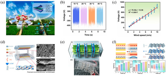 (a) Schematic of the HEC−TENG for self-powered wind direction and velocity monitoring; (b) the output voltage of the HEC−TENG at different temperatures, with a wind speed of 7 m/s; (c) the linear fitting graph of wind speed and wind pressure measured by an array of 8 CE−TENGs; reprinted with permission from Ref. [95]. Copyright 2022, Elsevier. (d) The schematic diagram of the W−TENG device; (e) the schematic and photograph of a G−TENG array with three units; (f) the schematic illustration of the relationship between triboelectric output and surface roughness, with wrinkling range from 1.4 to 4.6 mm. Reprinted with permission from Ref. [41]. Copyright 2023, Elsevier.