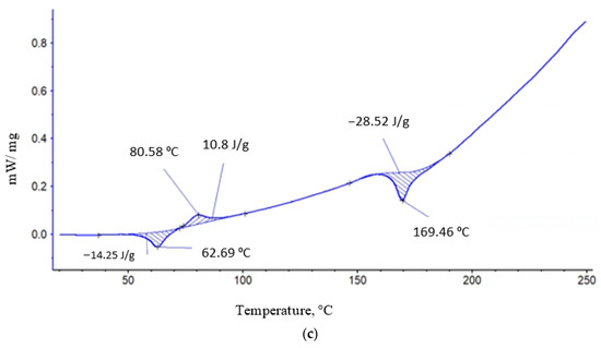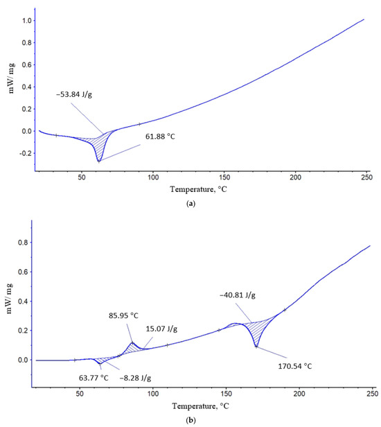 The samples were investigated by the DSC method using the NETSZCH STA 449 F5 Jupiter(New Castle, DE, USA). Briefly, 50–70 mg of the sample was loaded into a corundum crucible and heated in a stream of nitrogen at a flow rate of 100 mL/min in the temperature range from 20 to 250 degrees at a rate of 2 degrees per minute.