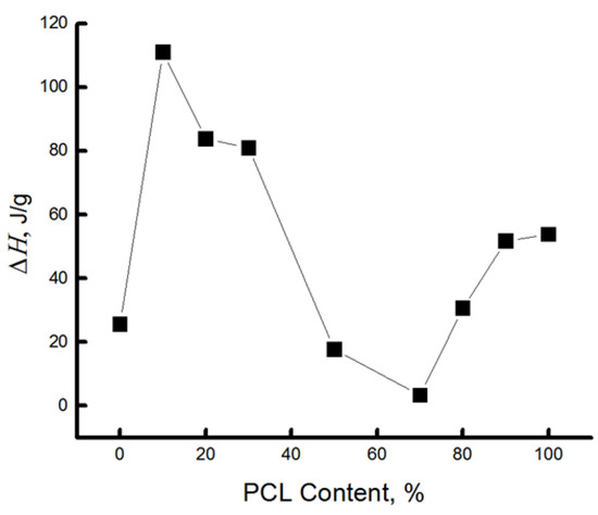With the addition of 10% PCL, the enthalpy of melting PLA increases dramatically (Figure 3) to the highest value. It can be assumed that the first portion of PCL is distributed in the system in the form of tiny particles, thereby plasticizing the structure of PLA, and, as a result, the proportion of straightened chains increases sharply; ΔH increases almost 4 times relative to the initial PCL crystallinity.