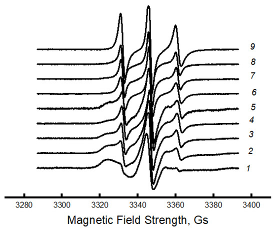 EPR spectra for PLA/PCL fibers: 1—100/0, 2—90/10, 3—80/70, 4—70/30, 5—50/50%, 6—70/30%, 7—80/20, 8—90/10, 9—0/100%.
