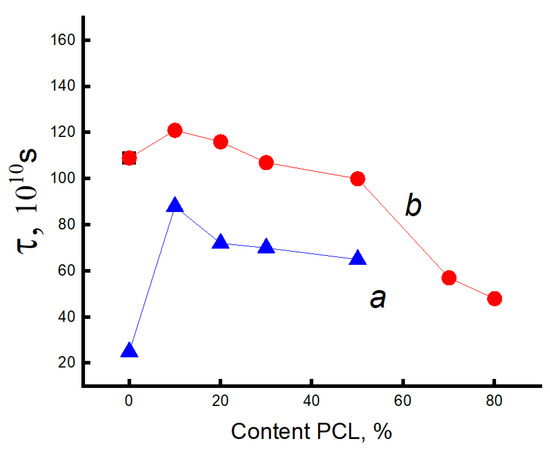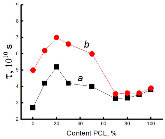 Using mathematical processing of the experimental spectra using a special program, Simfonia and Winer (Bruker®, Krailing, Germany), the correlation times in PLA and PCL with different proportions in the blend were calculated. Subtracting the spectrum of PCL from the spectra of the blend composition, the correlation time τ1 in PLA was calculated (Figure 6a).