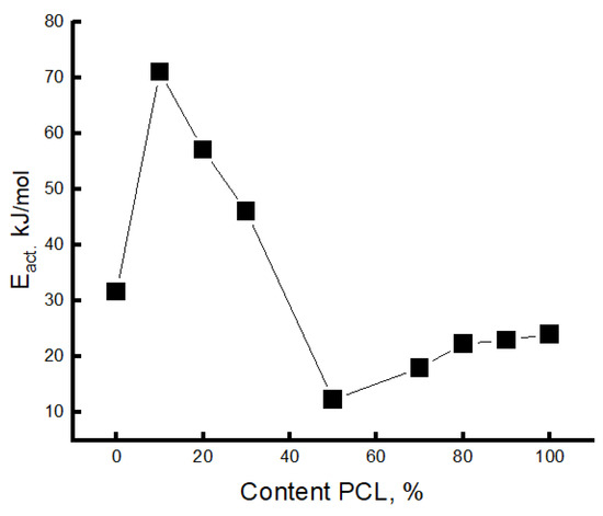 The values of Eτ decrease with increasing PCL concentrations in the system, and the regions of 50/50 and 70/30% concentrations are characterized by the lowest values (the region of phase inversion). At higher PCL concentrations in the system, the Eτ values are slightly increased. The obtained result also confirms the conclusion about the presence of phase inversion in the region of PCL concentration 50–70%, which corresponds to all previous results.