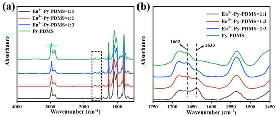 Figure 3a shows the FTIR spectra of the Eu3+-Py-PDMS, with an enlarged view presented in Figure 3b. Upon the incorporation of Eu3+, notable changes in peak intensities were detected at 1662 cm−1 and 1633 cm−1. As analyzed in Section 3.1, the peak at 1662 corresponded to the C=O group. According to reference [], the emergence of a new peak at 1633 cm−1 was attributed to the stretching vibration of C=O-Eu. As the molar ratio of Eu3+ to ligand increased from 1:3 to 1:1, the intensity of C=O peak gradually weakened until diminishing, while that of C=O-Eu peak steadily strengthened. These shifts in peak intensities suggested the coordination interaction between Eu3+ ions and the ligand of C=O groups in Py-PDMS. More importantly, such coordination interactions were observed to strengthen progressively with higher concentrations of Eu3+.