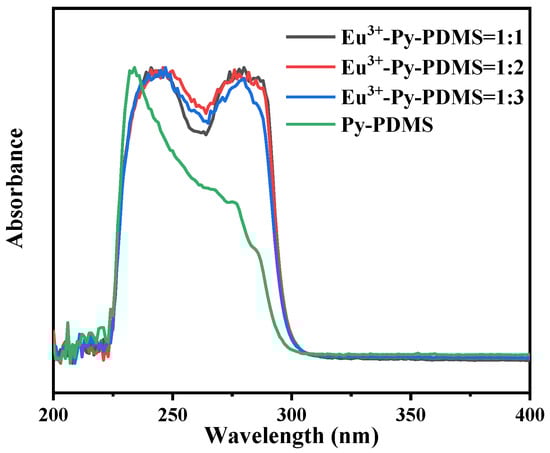 In Figure 4, the UV spectra of Py-PDMS exhibited a shoulder band at 233 nm, which was absent in Eu3+-Py-PDMS. Instead, two new shoulder peaks emerged at 244 nm and 278 nm. This phenomenon can be attributed to metal-to-ligand charge transfer interactions between Eu3+ and C-N and C=O bonds present in the Py-PDMS molecular chain. This change indicated a significant alteration in the electronic structure due to the incorporation of Eu3+, suggesting potential modifications in the chemical environment and bonding interactions within the complex.