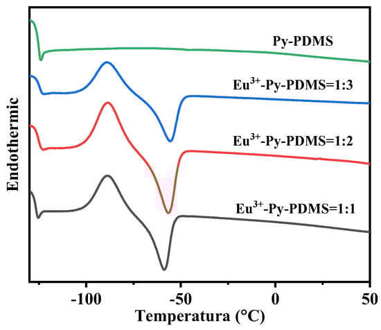Although the introduction of Eu3+ resulted in strong coordination bonds with Py-PDMS ligands, the molecular chains of Py-PDMS still retained great flexibility. As depicted in Figure 6, both Py-PDMS and all Eu3+-Py-PDMS complexes exhibited ultra-low glass transition temperatures (Tg) of approximately −125 to −123 °C. Interestingly, all curves of Eu3+-Py-PDMS complexes exhibited a melting peak around −50 °C. According to reference [], this transition temperature indicated the melting of the metal–ligand complex domains. In contrast, this melting peak was not observed in the curve of Py-PDMS. This phenomenon also demonstrated the successful formation of a coordination cross-linking network in Eu3+-Py-PDMS.