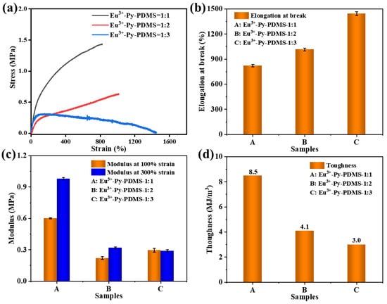 (a) Stress–strain curves of Eu3+-Py-PDMS; the values of (b) elongation at break, (c) modulus at 100% and 300% strain, and (d) toughness of Eu3+-Py-PDMS.