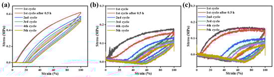 Cyclic stress–strain tests of Eu3+-Py-PDMS with a mole ratio of (a) 1:1, (b) 1:2, and (c) 1:3.