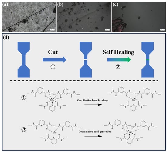 Optical microscope images of Eu3+-Py-PDMS with the mole ratio of 1:2 healed at different temperatures for 4 h: (a) 20 °C, (b) 40 °C, (c) 60 °C; (d) schematic diagram of the self-healing mechanism of Eu3+-Py-PDMS.
