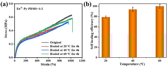 (a) Stress–strain curves of Eu3+-Py-PDMS with a mole ratio of 1:2 before and after self-healing at different temperatures for 4 h; (b) the self-healing efficiency of Eu3+-Py-PDMS with a mole ratio of 1:2 at different temperatures for 4 h.