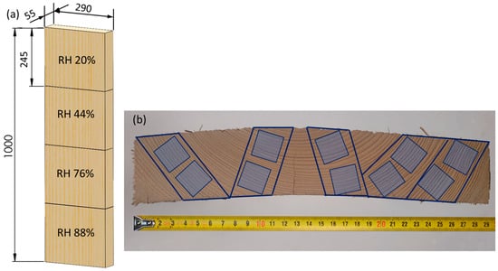 A 1 m long spruce board (Picea abies) with a cross-section of 290 mm × 55 mm and constant growth ring width was cut into 4 smaller pieces of 245 mm length, from which 10 strictly oriented samples of 245 mm × 22 mm × 22 mm were cut (Figure 1). The individual groups of 10 samples were then equilibrated to a constant sample mass at 22 °C and relative humidity (RH) of 20%, 44%, 76%, and 88%. After the final equilibration of the samples, they were cut to a final size of 200 mm × 20 mm × 20 mm. Additional samples were used to determine the equilibrium moisture content (EMC) of the wood for each combination of relative humidity. They were weighed after equilibration, then dried to absolute dryness at 103 °C and weighed again to determine the moisture content. The equilibrium moisture content of the samples at relative humidities of 20%, 44%, 76%, and 88% was 7.2%, 9.9%, 13.3%, and 19.1%, respectively.