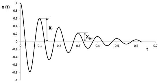 The term δn is called the logarithmic decrement, ζ is the damping factor, and Xi and Xi+n are the amplitudes at locations i and i + n, respectively, as shown in Figure 2.