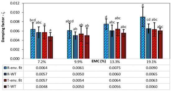 Table 1 shows the results of the statistical analysis, which confirms that the method used to determine the damping factor, the vibration direction of the sample, and the EMC significantly influence the damping factors. A post hoc analysis was carried out to determine statistical differences between the groups, which can be seen in Figure 3. Groups that do not differ statistically at a p-value of 5% are labelled with the same letters. According to the analysis, the damping factors determined by envelope fitting and WT do not differ significantly in the radial direction for EMCs of 7.2% and 9.9%, while they differ significantly only for EMCs of 13.3% and 19.1%. In the tangential direction, in contrast, the damping factors determined with the two methods do not differ significantly for all EMCs.