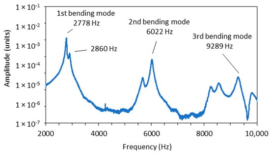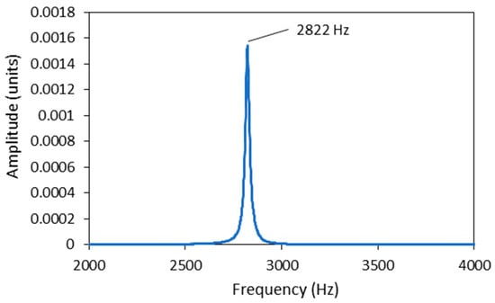 It should be noted that in some samples, the torsional vibration was not excited, and only the fundamental natural frequency of the first bending vibration mode was present. In this case, the damping factors determined with the envelope fit and the WT method were almost the same. There were very few such cases, as in most instances, a torsional vibration was excited in addition to the bending vibration, which could not be avoided due to the square cross-section of the specimen. A good example of this can be seen in Figure 8 and Figure 9, the first showing the time response with the natural frequency of 2822 Hz together with the fitted envelope, and the second showing the frequency spectrum. The corresponding damping factor determined from the envelope fit and wavelet transform was 0.0048 and 0.0046, respectively.