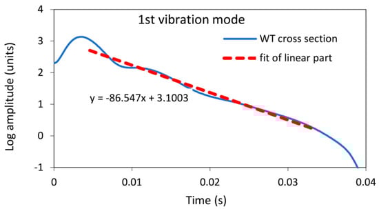 The damping factor determined by the wavelet transform for the same sample was 0.00496. The contour plot of the WT can be seen in Figure 6, where the decay of the amplitude of the natural vibration at a frequency of 2778 Hz is clearly visible. The cross-section of the wavelet transform for the values of the dilation related to the analysed modal frequencies of 2778 Hz, plotted in a semi-logarithmic plot, is shown in Figure 7. The damping factor determined from the slope of the linear part using Equation (18) is 0.00496, which is significantly less than 0.0074 and determined from the envelope fit of the time response. This is because the WT only takes into account the vibrations at 2778 Hz, while other frequencies have been filtered out.