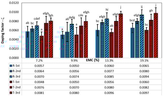 Damping factors at different EMCs, directions of vibration (R—radial, T—tangential), and vibration modes (1st, 2nd, 3rd). The vertical lines represent the standard deviation. The columns with the same letter do not differ significantly from each other at a p-value of 0.05.