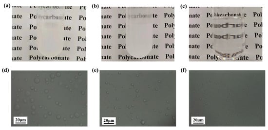 Optical clarity of monomer mixtures with 5wt% (a) p-PDMS, (b) a-PDMS, and (c) PEMS loading at 160 °C. Dispersion of (d) p-PDMS, (e) a-PDMS, and (f) PEMS in monomer mixtures.