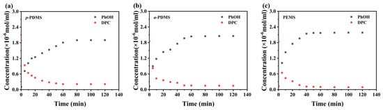 The concentration changes of PhOH and DPC during transesterification of DPC and diols at 180 °C in the system with 15 wt% (a) p-PDMS, (b) a-PDMS, and (c) PEMS loading.