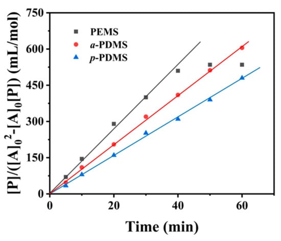 According to Formula (1), the transesterification reaction rate constant k′ can be obtained from the slope of the straight line in Figure 3. Table 1 lists the relevant data showing that the k′ of the PEMS system is the largest, indicating that the reactivity of PEMS is greater than that of a-PDMS and the reactivity of p-PDMS is the poorest. Because PEMS disperses better in the reaction system in the molten state, making more complete transesterification reactions at the silicone interface. The reactivity of a-PDMS is higher than that of p-PDMS, in addition to the slight difference in the size of the dispersed phase; the larger reason may be that the phenolic hydroxyl group exhibits steric hindrance due to the benzene ring, inhibiting the nucleophilic substitution reaction of oxygen anions with electrophilic groups, thus making the alcohol hydroxyl group more reactive than the phenolic hydroxyl group [36].