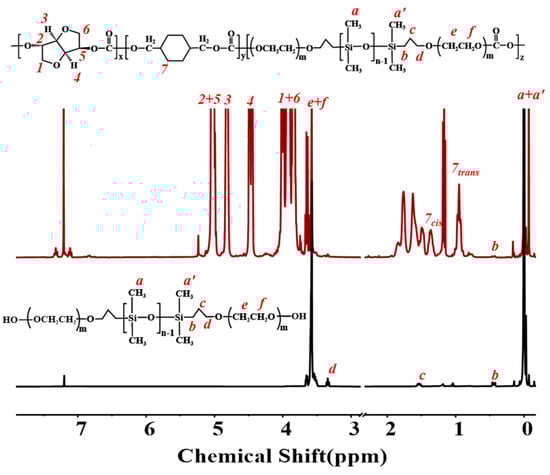 The unreacted silicone monomers and oligomers can be effectively removed through repeated precipitation and washing three times. The 1H-NMR spectra of ICS-PC containing PEMS are shown in Figure 4, and the 1H-NMR spectra of copolymers containing p-PDMS and a-PDMS are shown in Figures S1 and S2. The block contents (W, wt%) and conversions (%) of silicones can be calculated using 1H-NMR. They were measured by the following:
