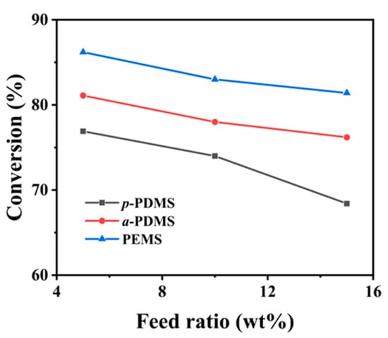 The conversion rates of three types of silicones with different feed ratios, as shown in Figure 5, indicate a gradual decrease as the amount of silicone feed increases. Moreover, when the amount of silicone feed is the same, the conversion rate of PEMS can reach 86%, higher than that of a-PDMS, with p-PDMS having the lowest conversion rate. The analysis of the reasons is as follows: Firstly, PEMS exhibits higher reactivity and stronger diffusion ability compared to a-PDMS and p-PDMS, making it more easily dispersed in the system to participate in reactions. Secondly, due to the polar polyether segments in PEMS, it possesses good water solubility and surface activity, thus having better solubility with hydrophilic ISB and CHDM, increasing system compatibility. Additionally, in the final polycondensation stage, silicone undergoes chain scission under high temperature, vacuum, or strong alkaline catalysis, resulting in the shortening of siloxane chain lengths and the residue of cyclic siloxanes [28,29], which may be the reason why PEMS has trouble reaching conversion rates above 90%.