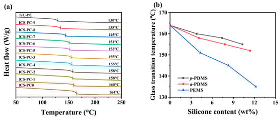 Because of the excellent flexibility of the main chain structure of siloxane, it can enhance the segmental mobility of copolymers and reduce the Tg of copolymers. Figure 6 shows the DSC spectra of ICS-PCs and the Tg variation curves. The Tg of ICS-PC is higher than that of IcC-PC with the ISB/CHDM molar ratio of 70/30 because the rigid ISB content increases to 90% in the ICS-PC system. And with the increase in flexible silicone content, the Tg decreases. Furthermore, the Tg of the a-PDMS system is lower than that of the p-PDMS system at the similar silicone content, which may be related to the existence of two rigid phenolic hydroxyl groups in p-PDMS monomer, or it may stem from differences in silicone phase size between the two systems. In particular, the Tg of PEMS system decreases significantly with the increase of silicone content, which may be attributed not only to the addition of low Tg polyether segments but also to the reduction of PEMS phase size due to the compatibilization of polyether segments, leading to better flexibility. When the PEMS content is 4.3 wt%, the Tg of copolymer is maintained at 151 °C.