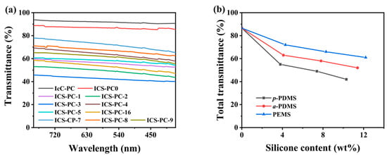 Effect of silicone types and contents on (a) light transmission and (b) total transmission of copolymer films with thicknesses of 80 μm.