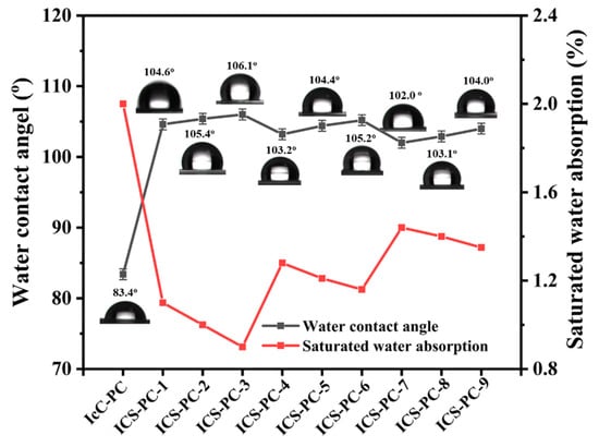 Introducing hydrophobic silicone into PC can reduce the surface energy of the polymer film, thus decreasing its hydrophilicity. Figure 9 shows the water contact angle test results of ICS-PC films with different silicone contents, indicating that as the silicone content increases, the hydrophobic structural units increase, leading to an increase in the water contact angle of the copolymer films. The reason is that compared to the surface tension of PC, which is 40~60 mN/m and water, which is 72 mN/m, the surface tension of silicone is only 20~25 mN/m [38]. Therefore, siloxane segments are prone to aggregate on the film surface due to their low surface tension, enhancing the hydrophobicity of films. Different types of silicone have varying effects on the hydrophobic performance of copolymers. For the a-PDMS system, p-PDMS, containing a steric hindrance phenyl ring structure, acts as a shield, protecting the internal hydrophilic segments from the influence of external humid environments, resulting in higher water contact angles for its copolymer films [39]. When the p-PDMS content is 3.8 wt%, the water contact angle is 104.6°. At similar content, influenced by the hydrophilic polyether segments in the molecular structure, the water contact angle of the PEMS system is 102°, lower than that of the a-PDMS and p-PDMS systems. Even so, the hydrophobicity of the PEMS system is significantly higher than that of IcC-PC. Figure 8 also provides the saturated water absorption of various samples. It is found that the water absorption of ICS-PC is lower than that of IcC-PC due to the improved hydrophobicity of copolymers. Although the water absorption of the PEMS system is relatively higher compared to the a-PDMS and p-PDMS systems, the water absorption of ICS-PC-7 is 1.44%, significantly lower than that of the IcC-PC, which is 2%.