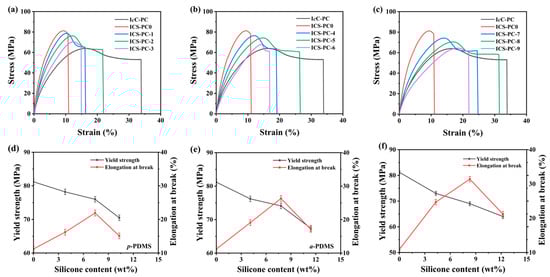 Stress–strain curves for ICS-PCs with (a) p-PDMS, (b) a-PDMS, and (c) PEMS. Yield strength and elongation at break for ICS-PCs with (d) p-PDMS, (e) a-PDMS and (f) PEMS.