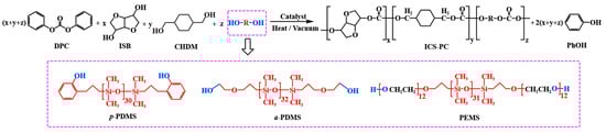 Isosorbide (ISB; 99.0%), 1,4-cyclohexanedimethanol (CHDM; 99.0%), and diphenyl carbonate (DPC; 99.0%) were provided by Ningbo Dafeng Jiangning New Materials Co., Ltd. (Ningbo, China). Phenol-hydroxyl silicone (p-PDMS; Mn = 2500 g/mol) and alcohol-hydroxyl silicone (a-PDMS; Mn = 2570 g/mol) were purchased from Anhui Ayota Co., Ltd. (Bengbu, China). Polyether silicone (PEMS; Mn = 3500 g/mol) was self-made by the laboratory. Sodium hydroxide (NaOH, 99%) was purchased from Shanghai Aladdin Biochemical Technology Co., Ltd. (Shanghai, China). Deuterated chloroform (CDCl3; 99.8%) was purchased from Beijing Brilliant Reagent Co., Ltd. (Beijing, China). Dichloromethane (CH2Cl2; 99.5%), chloroform (CHCl3; 99.0%), acetonitrile (C2H3N) and absolute ethanol (CH3CH2OH; 99.7%) were purchased from Shanghai Titan Technology Co., Ltd. (Shanghai, China).