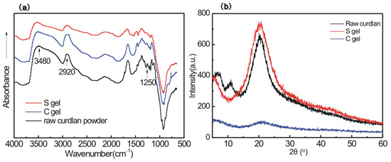 Diffuse reflectance infrared Fourier transform spectroscopy was performed on raw curdlan powder, S gel, and C gel using a Thermo Scientific (Waltham, MA, USA) Nicolet iS50R FIIR spectrometer. The sample compartment of the cell was filled with the as-prepared sample (~20 mg). Spectra were recorded from 4000 cm−1 to 650 cm−1, with 4 cm−1 resolution, and 120 scans were peformed in each acquisition.