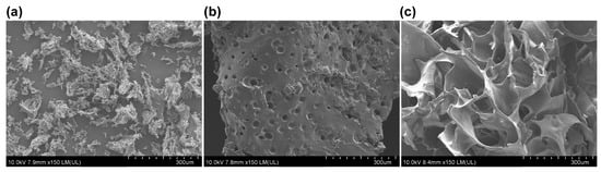 SEM is an effective tool for analyzing the surface morphology of native polysaccharides and their derivatives at a submicron level [32,33]. For comparison, the SEM images of raw curdlan powder, C gel, and S gel are displayed in Figure 3. The raw curdlan powder shows a sawdust-like image, while the surfaces of the C gel and S gel are continuous due to chemical crosslinking of the EGDGE. Specifically, C gel has a smooth surface, with ~30 μm pits and pores, revealing that the textural structure of C gel with a coiled skeleton is tightly packed. In contrast, S gel has a honeycomb-like surface, with large pores ranging from 50 to 200 μm, and the surface of the pore wall is smooth. The SEM images in Figure 3 provide direct evidence of the formation of S gel and C gel, and the different microstructures can reflect the swelling behaviors of prepared curdlan hydrogels.