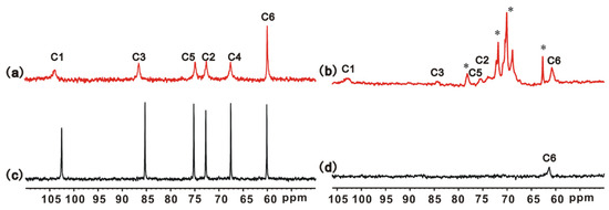 13C NMR spectra of 5 wt% curdlan/0.4 wt% NaOH aqueous solution at 40 °C (a), and 5 wt% curdlan/2 wt%NaOH solution at 25 °C (c); 13C HRMAS NMR spectra of swollen S gel (b), C gel (d) with the 1:15 gel:water by mass at 25 °C; and the asterisk (*) represents the peaks of the crosslinking agent.