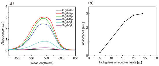 (a) UV–Vis curves of S gel and C gel activation of coagulation Factor G in a series of tachypleus amebocyte lysate agents (5, 8, 16, 20, and 24 μL), and (b) the curve of maximum absorbance of S gel vs. tachypleus amebocyte lysate fractions.