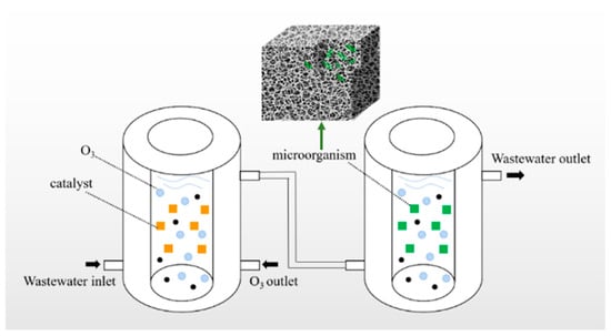 Individual ozone catalytic oxidation technology has the disadvantages of high ozone depletion, high reaction selectivity, low mineralization rate, etc., and the combination of ozone catalytic oxidation and other process technologies has become a hotspot of current research. Su [] used ozone oxidation and biodegradation synergistic technology to treat simulated tetracycline hydrochloride wastewater and real coking wastewater biological effluent and found that the removal rate of tetracycline hydrochloride could reach 97%. In addition, the removal rate of COD in real coking wastewater increased to 34%, which increased the removal rate by 76%. Zhou [] used microbubble ozonation catalytic oxidation and biochemical synergistic technology to treat real coal chemical wastewater deeply. He found that biological treatment alone can reduce COD by 40%, and the ozone-catalyzed oxidation–biochemical synergistic process can improve COD removal by 26.7% to reach 66.7%.
