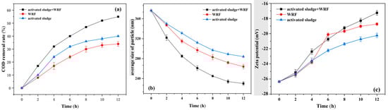 In the OCB system, the selection of microbial populations affects the degradation of the ozone-catalyzed effluent because of the different biocompatibilities of microbial populations to polyurethane sponges. Therefore, three different microbial communities, i.e., activated sludge, WRF, and a mixed system of activated sludge and WRF, were selected to compare their degradation effects on ozone-catalyzed oxidation of effluent water in order to select a suitable microbial system. Meanwhile, the zeta potential and average particle size can describe the DCS content to some extent, so the changes in COD, zeta potential, and average particle size were investigated.