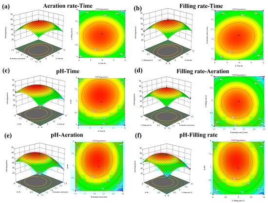COD removal rate as response value response surface diagrams and diagrams: (a)Aeration-Time; (b) Filling rate-Time; (c) pH-Time; (d) Filling rate-Aeration; (e) pH-Aeration; and (f) pH-Filling rate. The colours in the graph from red to green indicate a gradual decrease in the rate of degradation.