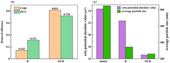 Character changes after degradation by OCB and B: DCS, COD (a) and zeta potential, average particle size (b).