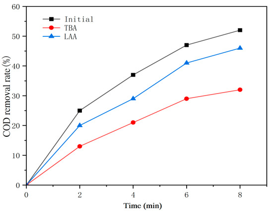 The reaction mechanism during ozone catalysis in OCB was verified using a free radical trapping agent. As shown in Figure 5, the removal of COD from OCC paper wastewater was reduced from 52% to 45% and 31% by using two free radical scavengers, i.e., tert-butanol (TBA, 0.5 mmol/L) and ascorbic acid (LAA, 1 mmol/L), which capture and , respectively. This indicates that in the OCB system, both and were produced, and was dominant. The activated oxygens attack the organics, which are difficult to degrade in the wastewater, forming intermediates that are subsequently mineralized in biodegradation.