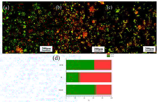 The distribution of active and dead bacteria before and after degradation: (a) before degradation; (b) after B degradation; (c) after OCB degradation; and (d) the ratio of active and dead cells after B and OCB degradation.