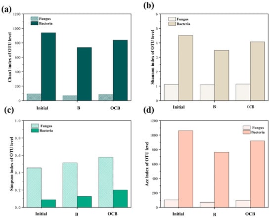 Alpha diversity is used to assess the abundance of species within a certain range or system, including the Ace index, Chao1 index, Shannon index, and Simpson index. the Ace index and Chao1 index are used to assess the species richness in a system []. As can be seen from Figure 8a,d, the Ace and Chao1 indices of the biofilm samples treated by the OCB and B systems were lower than those of the initial samples, which indicated a significant decrease in the species richness. This is mainly due to the toxic effect of the organic matter in the OCC pulping wastewater, where some microorganisms could not survive under the higher pollution load. In addition, there is a natural selection process among microbial communities under this organic load []. It should be emphasized that in the OCB system, the Ace and Chao1 indices decreased to relatively low values. This is due to the fact that after ozone catalysis, the macromolecular organic matter in the OCC pulping wastewater is converted into intermediates with relatively low toxicity. The Shannon and Simpson (Figure 8b,c) indices were used to assess the microbial diversity in the systems. Compared with the original samples, the Shannon and Simpson indices of both the B and OCB systems decreased, indicating that the microbial diversity also varied with the growth environment. The diversity of microbial communities also decreased to different degrees after the treatment of OCC pulping wastewater. In addition, the Shannon index of fungi remained relatively stable, which may be due to the presence of dominant fungal species and the fact that certain fungi can maintain their growth level by degrading polyurethane sponges [].